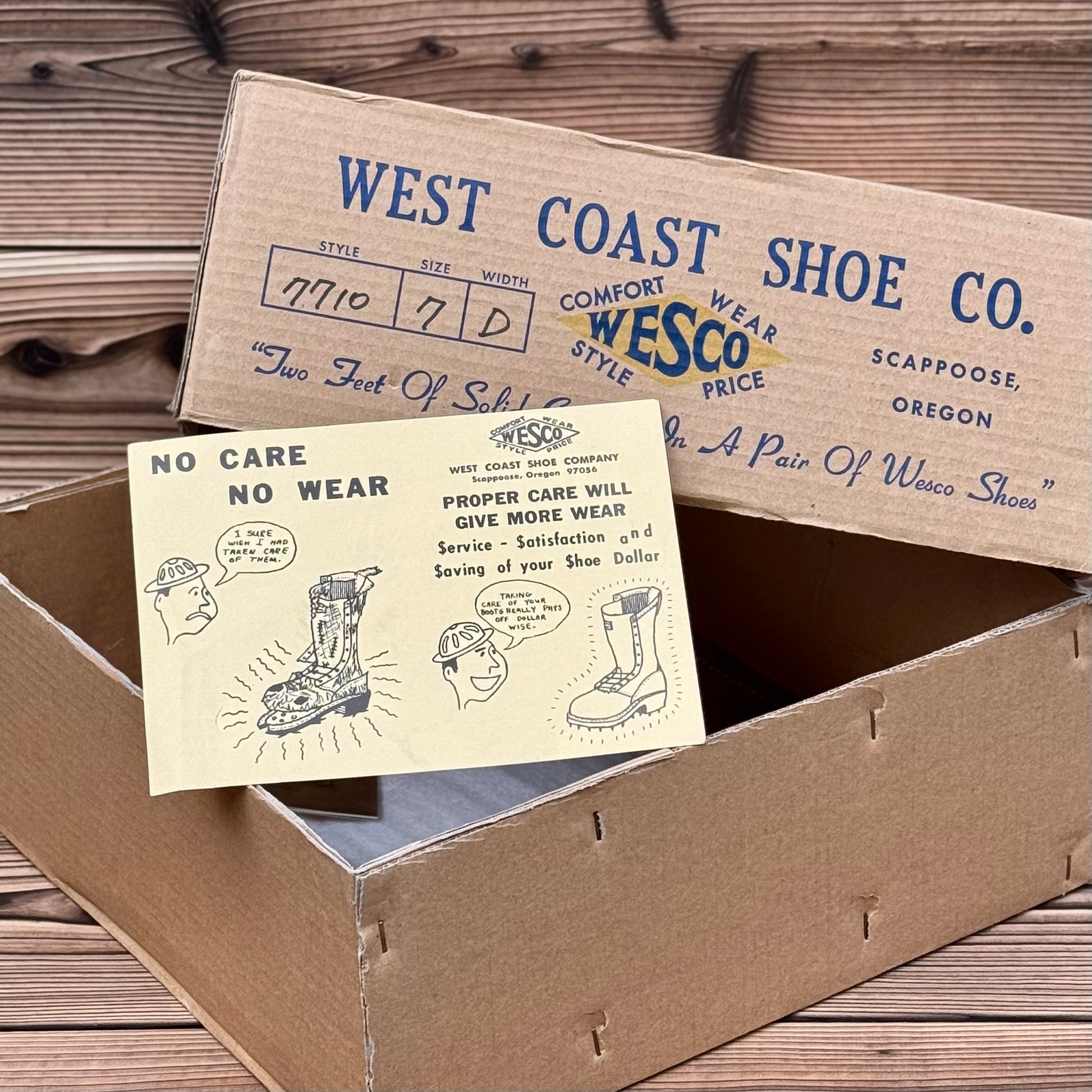 1930~50年代のWESCOブーツに見られる特徴的でシャープなつま先の形状やトリプルステッチ、鉄製の逆反りローラーバックル、ビンテージロゴなどのディテイル。加えてこのブーツのための専用シューボックスも備わっています。